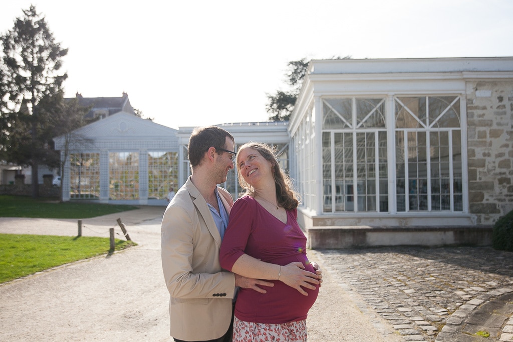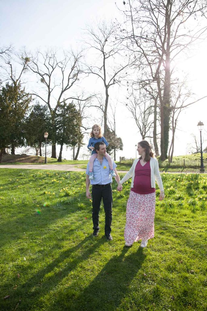Les rayons du soleil traversaient les arbres du parc et créaient une ambiance très naturelle. Cette lumière délicate sublimait le ventre arrondi de la future maman tout en apportant de la douceur aux portraits de famille.